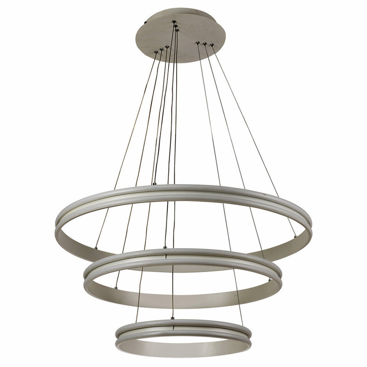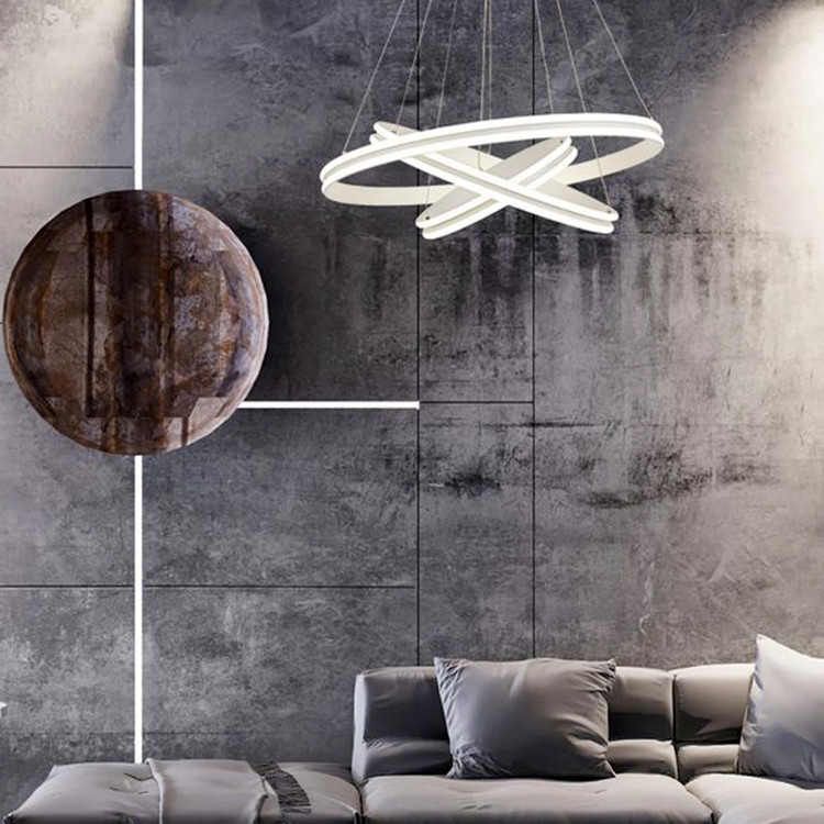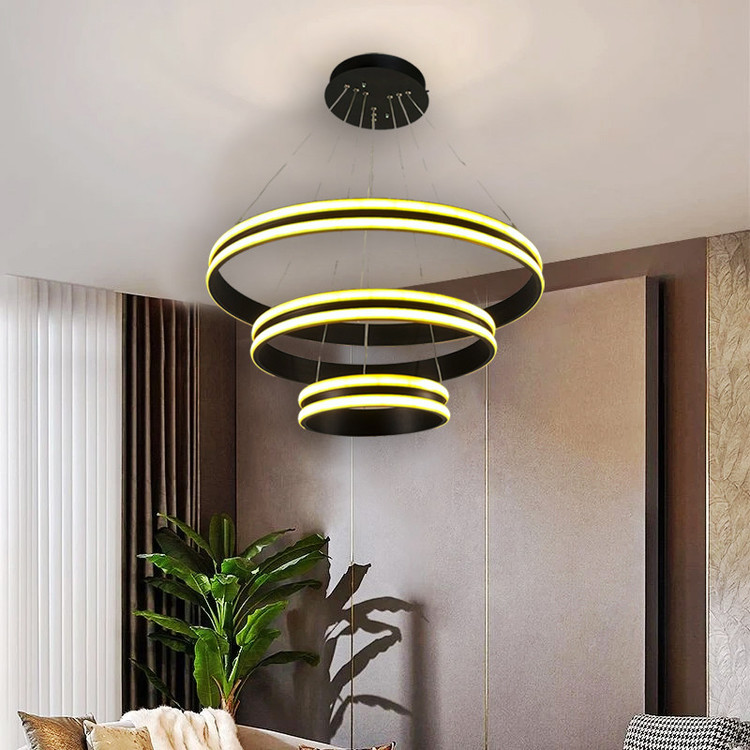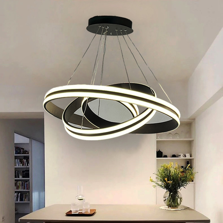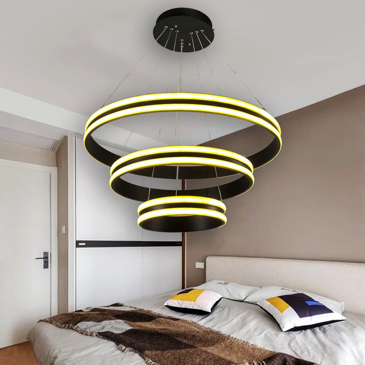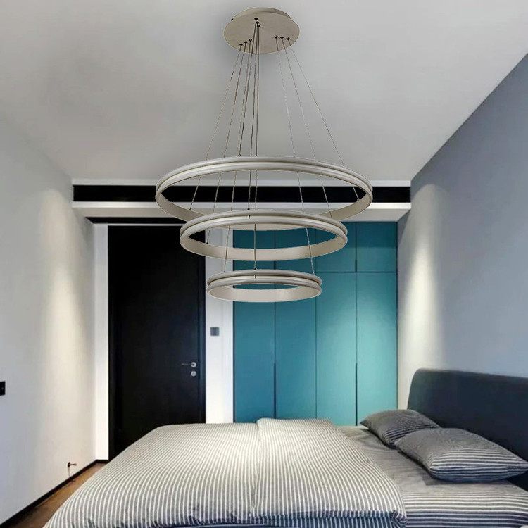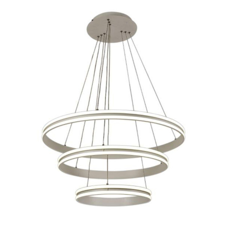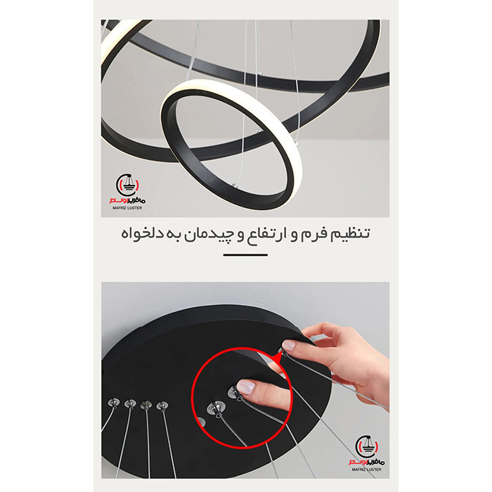 لوستر آویز مدل مدرن دایره ای سه لاین با قطرهای 60/40/20 سانتی متر توسط سیم آویز به ارتفاع حدود 110 سانتی متر مهار شده است و قابلیت تنظیم ارتفاع، فرم و چیدمان دارد این آویز سه حلقه شامل سه نور مهتابی ، آفتابی و نچرال میباشد که با ریموت کنترل و اپلیکیشن تلفن همراه قابل تغییر میباشد و همچنین دارای رنگ بدنه سفید ، مشکی میباشد که در قسمت تنوع کالا قابل انتخاب میباشد. مناسب انواع فضاهای مسکونی ، اداری و تجاری میباشد و همچنین مناسب برای روی کانتر ، میز غذاخوری و سایر موارد دیگه میباشد